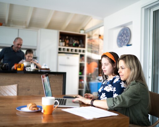 Mother working at home with daughter with special needs